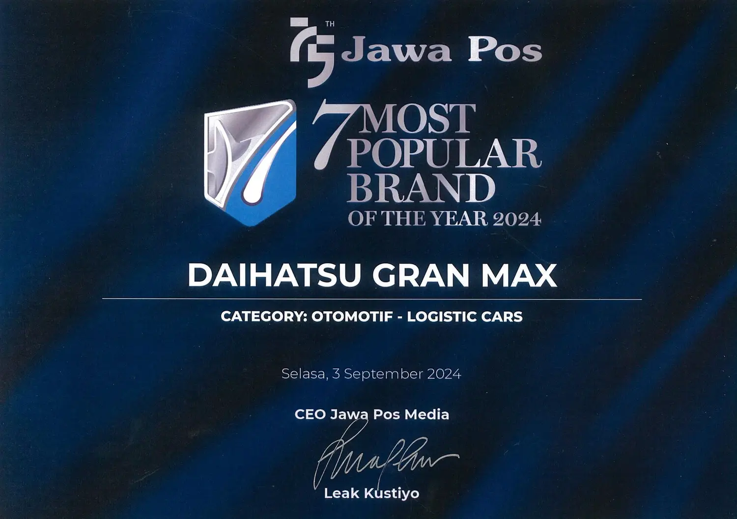 Daihatsu Gran Max berhasil mendapat penghargaan pada kategori otomotif mobil logistik di pagelaran acara 7 Most Popular Brand Of The Year 2024 yang di selenggarakan Jawa Pos.