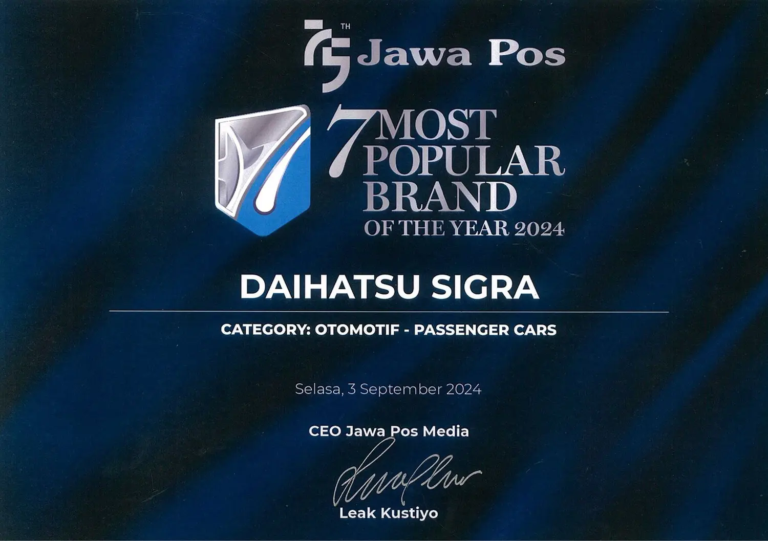 Daihatsu Sigra berhasil meraih penghargaan sebagai salah satu mobil terfavorit pada kategori otomotif passenger cars di pagelaran acara 7 Most Popular Brand Of The Year 2024 yang di selenggarakan Jawa Pos.